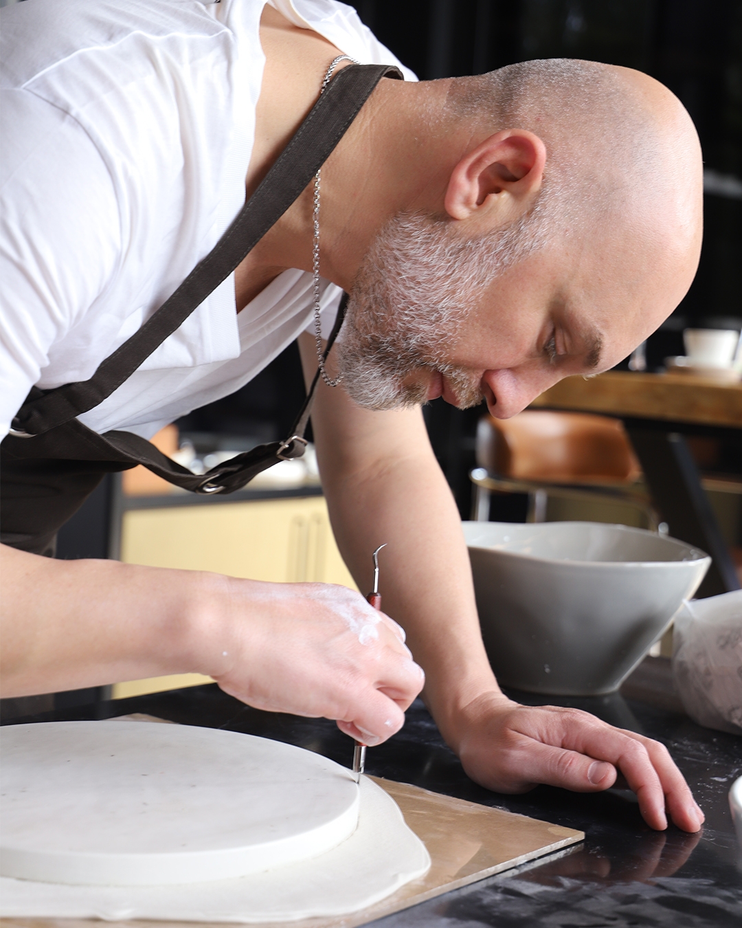 Her tabak, yemeğin formu, dokusu ve ruhu düşünülerek tasarlanır. Bu nedenle üretimde handmade Limoges porselen tercih edilir; çünkü bu malzeme yalnızca dayanıklılığıyla değil, ışığı yansıtma biçimiyle de yemeği ön plana çıkaran özel bir yüzey sunar. Bu proses bizim için yalnızca bir üretim süreci değil; gerçek bir zanaatkârlık ritüelidir.