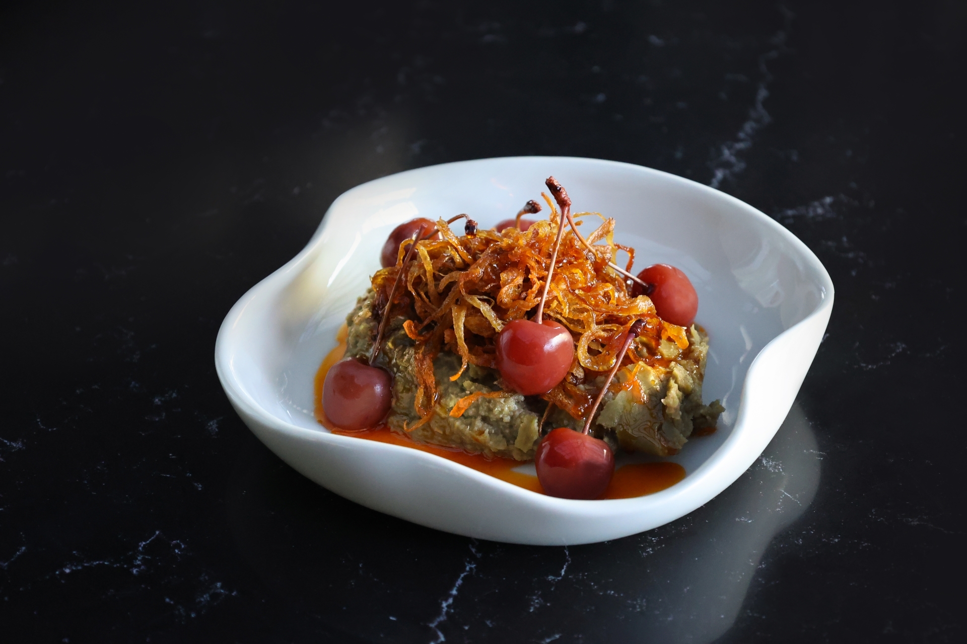 Kızarmış Soğanlı, Kiraz Turşulu Mercimek Fava; mercimek favanın sakin, kremamsı yapısı kızarmış soğanın aromasıyla birleşir. Tercihe göre bakla veya yeşil mercimek ile hazırlanabilen bu tabak, 7 Mehmet’in kendine özgü sunum anlayışıyla sade malzemelerin uyumunu vurgular.